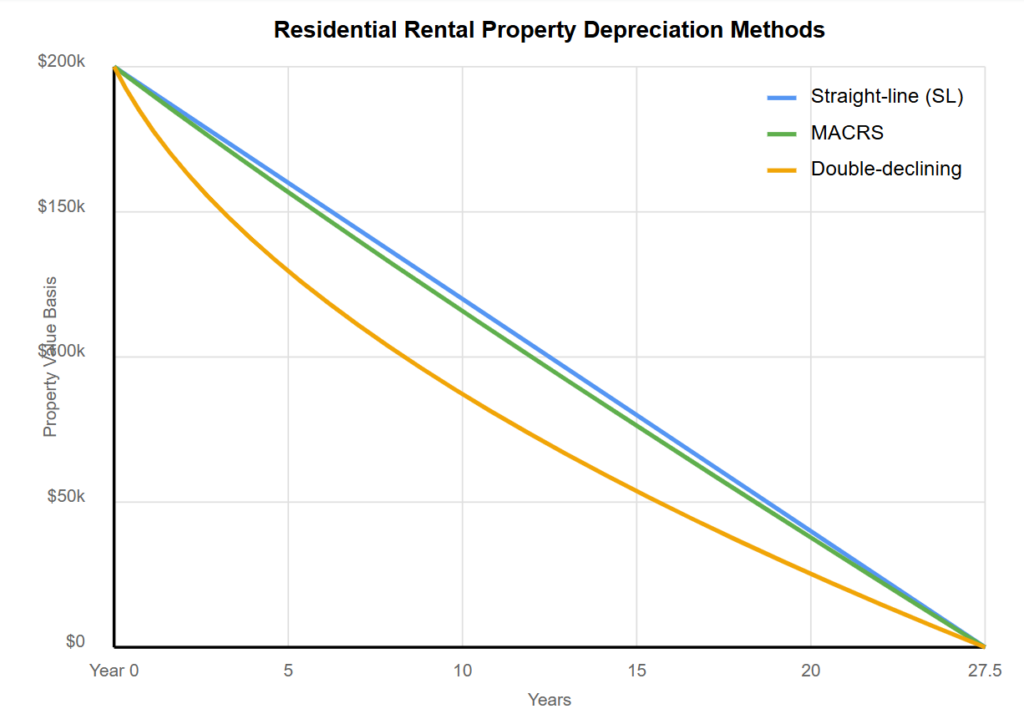 This graph illustrates three common depreciation methods for a $200,000 residential rental property over its 27.5-year recovery period. The blue straight line shows the standard straight-line depreciation method, where the property’s value decreases evenly each year (approximately $7,272 annually). The green line represents MACRS depreciation, which allows for faster depreciation in the early years. The orange line shows double-declining balance depreciation, which provides the most aggressive front-loaded depreciation but eventually switches to straight-line to ensure full depreciation over the recovery period. Note that while the property’s market value may increase over time, this graph shows the depreciation of the property’s tax basis for IRS purposes.