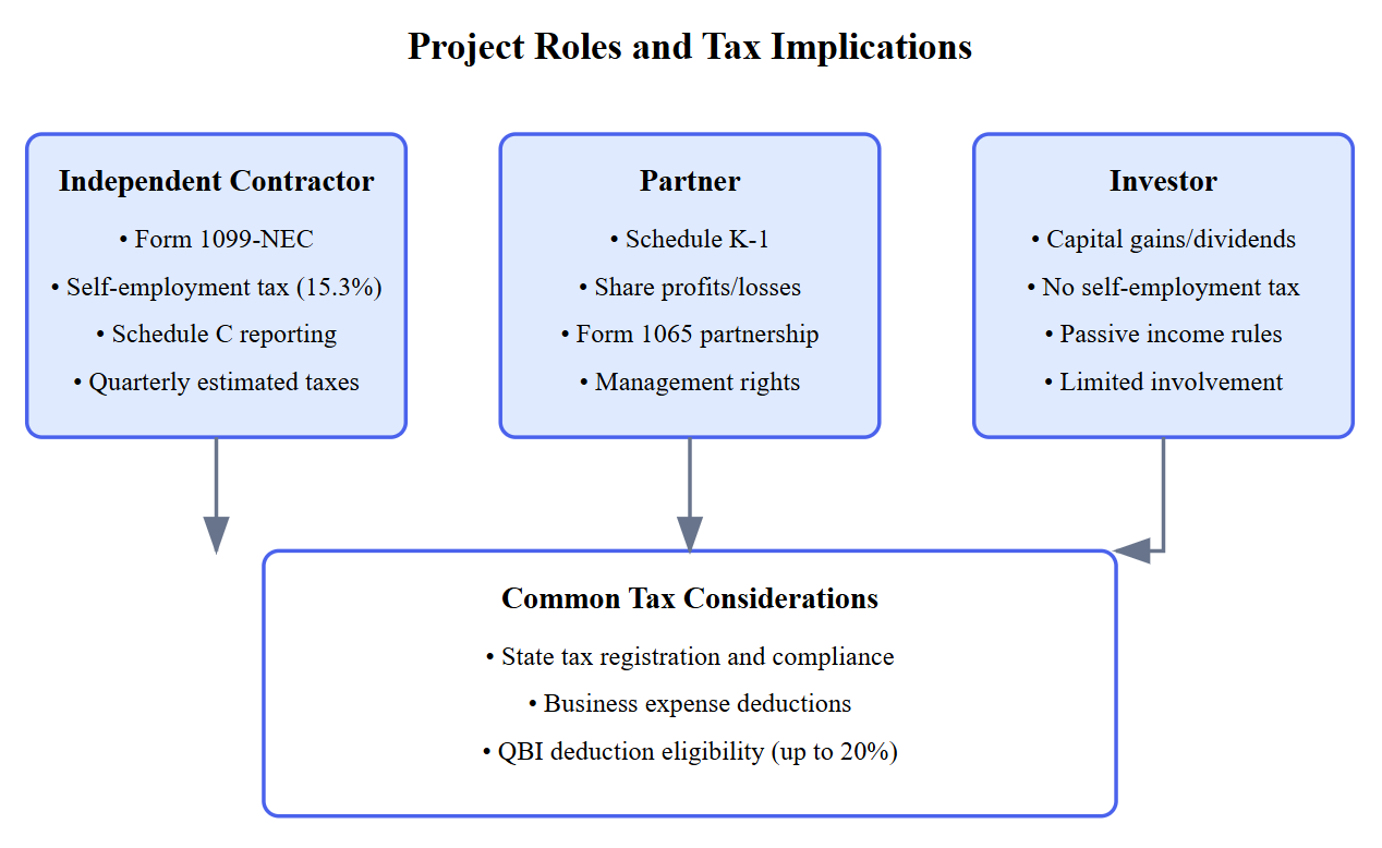- Partner: If you share in the profits, losses, and management of the project, you’re likely a partner in a partnership. This usually means filing a Schedule K-1 of Form 1065 and paying taxes on your share of the partnership’s income.