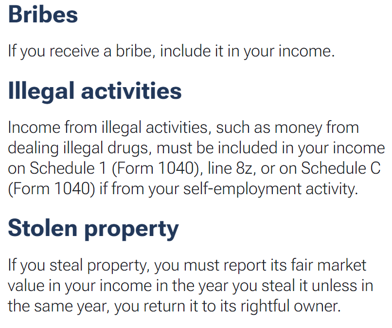 - The IRS requires taxpayers to report all income, regardless of its source, including income from illegal activities. (IRS Publication 17)