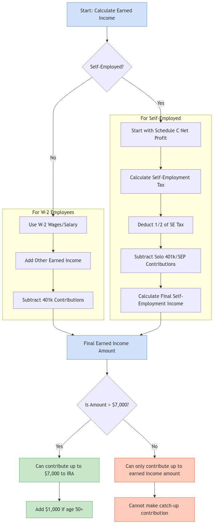 - Example 2: David is self-employed and has a net profit of $40,000 from his business. He contributes $10,000 to a solo 401(k). He calculates his self-employment tax to be $5,652. After deducting half of the self-employment tax ($2,826) and his solo 401(k) contribution, his earned income for IRA purposes is $27,174 ($40,000 – $2,826 – $10,000). He can contribute up to $7,000 to a traditional IRA.