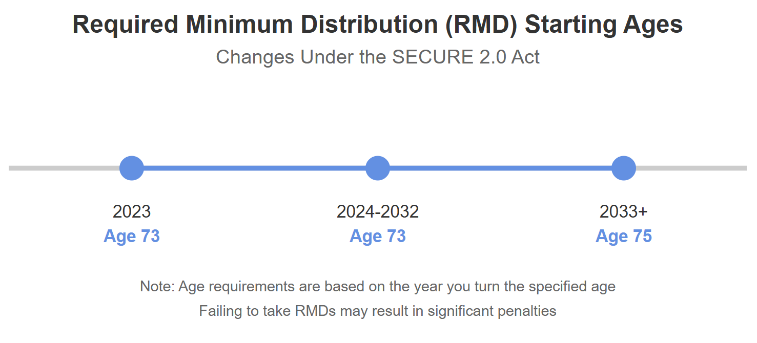 - Starting Age: Currently, the age for starting RMDs is 73. However, the SECURE 2.0 Act gradually increases this age to 75 by 2033.